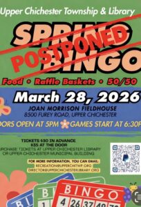 Our Bingo tonight March 28 has been postponed to Saturday, June 27 due to the water main break. Tickets will be honored for the new date. If you can’t attend Bingo in June, your money will be refunded. Tickets must be brough into the library for a refund. Thank you for understanding.