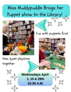 Wonderful Wednesdays: Mrs Muddypuddle brings her puppet show to the Upper Chi Library April 1, 15 & 29 at 10:30 AM. Bring the kids on over!